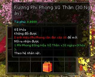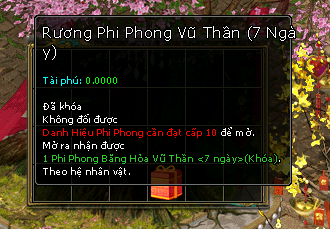 - Vật phẩm liên quan : Rương Phi Phong Vũ Thần ( 7 Ngày ) , Rương Phi Phong Vũ Thần ( 30 Ngày )